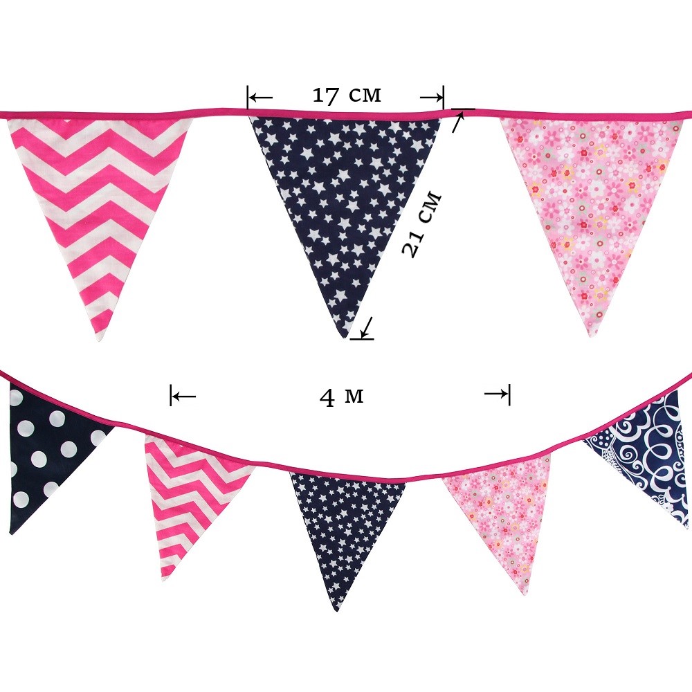 Гирлянда состоит из 12 флажков. Расстояние между флажками - 6 см, общая длина составляет 4 м.