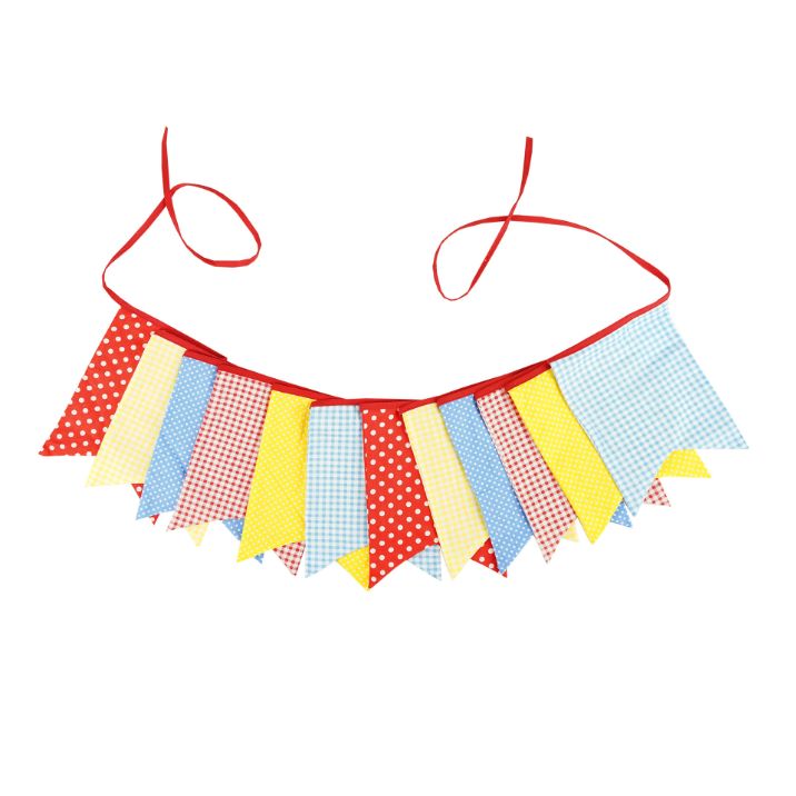 Гирлянда состоит из 12 флажков, общая длина составляет 3,4 м, расстояние между флажками 3 см, длина матерчатых флажков 2,1 м, длина лямок с обеих сторон по 50 см