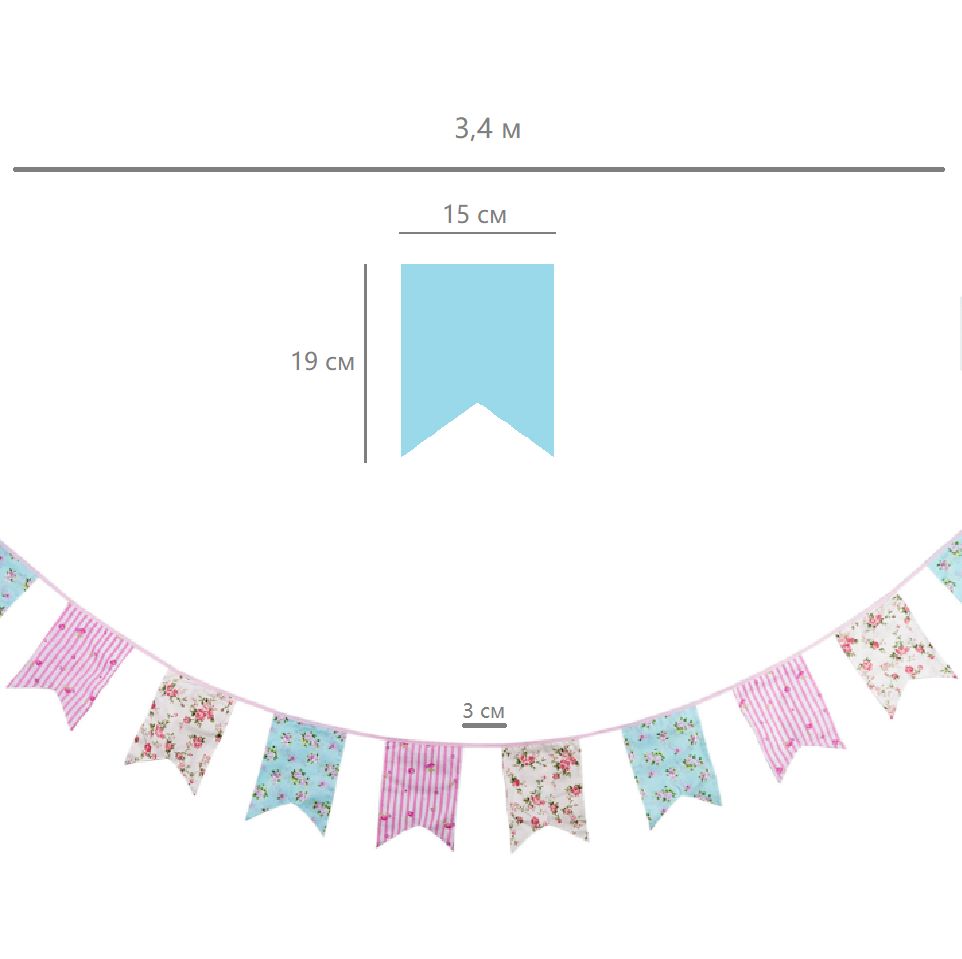 Гирлянда состоит из 12 флажков, общая длина составляет 3,4 м, расстояние между флажками 3 см, длина матерчатых флажков 2,1 м, длина лямок с обеих сторон по 50 см