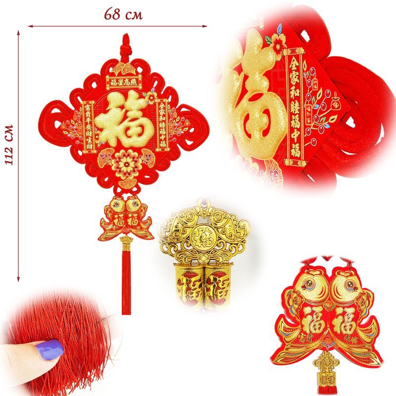 Традиционный китайский узел в форме ромба с символичным дизайном. Яркое сочетание красного бархата и золотых элементов создает эффектный акцент в интерьере.