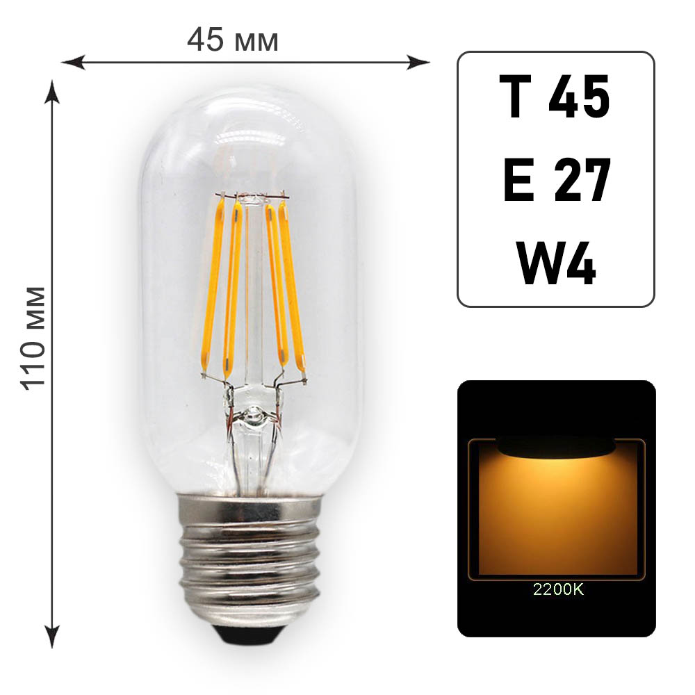 Лампа светодиодная Т45 E27 W4 K2200 филаментный вариант – с мощностью 4Вт. Цветовая температура составляет 2200 К. Гарантия от производителя – 5 лет. Лампа энергоэффективна и не содержит вредных соединений. Может использоваться как внутри, так и снаружи помещений. Устанавливается в патрон стандарта E27.