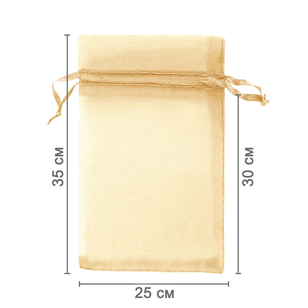 Мешочек из органзы 25 х 35 см — практичный аксессуар для упаковки крупных предметов и подарков. Лёгкая ткань подчёркивает содержимое и придаёт праздничный вид.