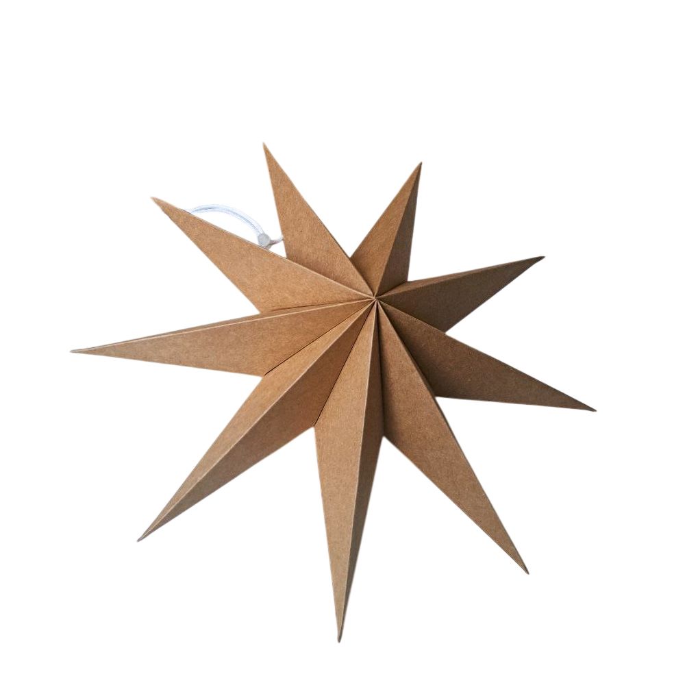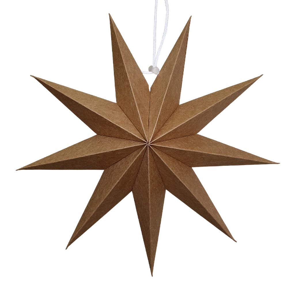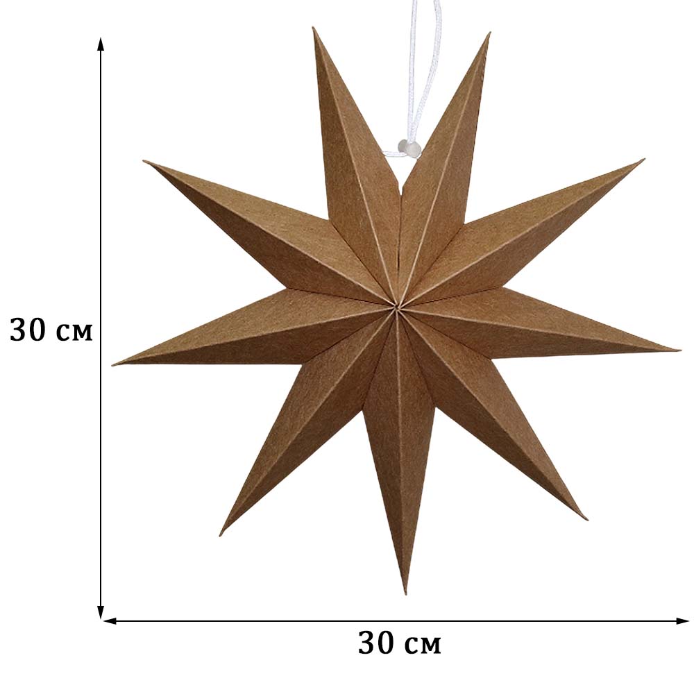 Объёмная декоративная звезда из картона диаметром 30 см с 9 лучами. Оснащена встроенным шнурком для подвешивания. Поставляется в компактном сложенном виде и быстро собирается: специальный шнурок при затягивании придаёт изделию объём и фиксирует форму. После сборки звезда остаётся устойчивой без дополнительных креплений и может использоваться многократно.
